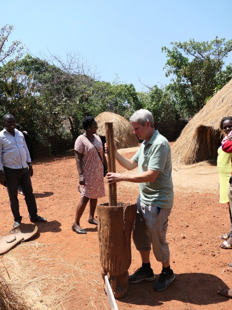 4️⃣ Un touriste découvre la tradition du pilage du manioc — immersion authentique dans la culture burundaise.